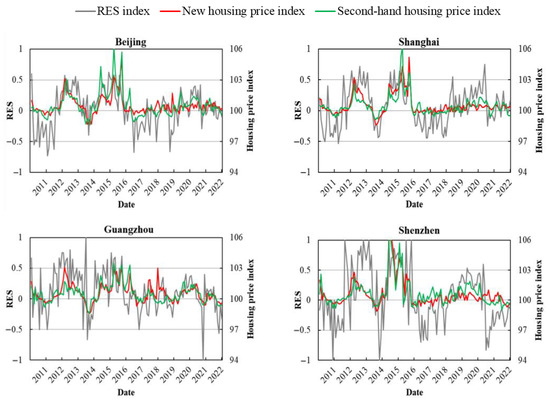 Overall, the RES index of Beijing has the least impact on the housing price index, Shanghai and Guangzhou exhibit similar trends in both new and second-hand housing price indices, whereas Shenzhen displays a distinct difference between the new and second-hand housing price indices.