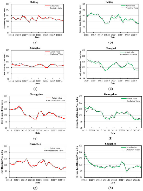 Figure 6 presents the visualization of the forecasting results of the eight VAR models from 2021 to 2022. Obviously, the forecasting results of all eight models align well with the actual values, indicating that the VAR models can capture a dynamic correlation between the RES index and the housing price index. Furthermore, the fitting results of (Figure 6a) and (Figure 6e) are superior to those of (Figure 6c) and (Figure 6g). Additionally, the fitting results of (Figure 6h) are better than those of the other three models (Figure 6b,d,f). This is consistent with the performance results presented in Table 5.