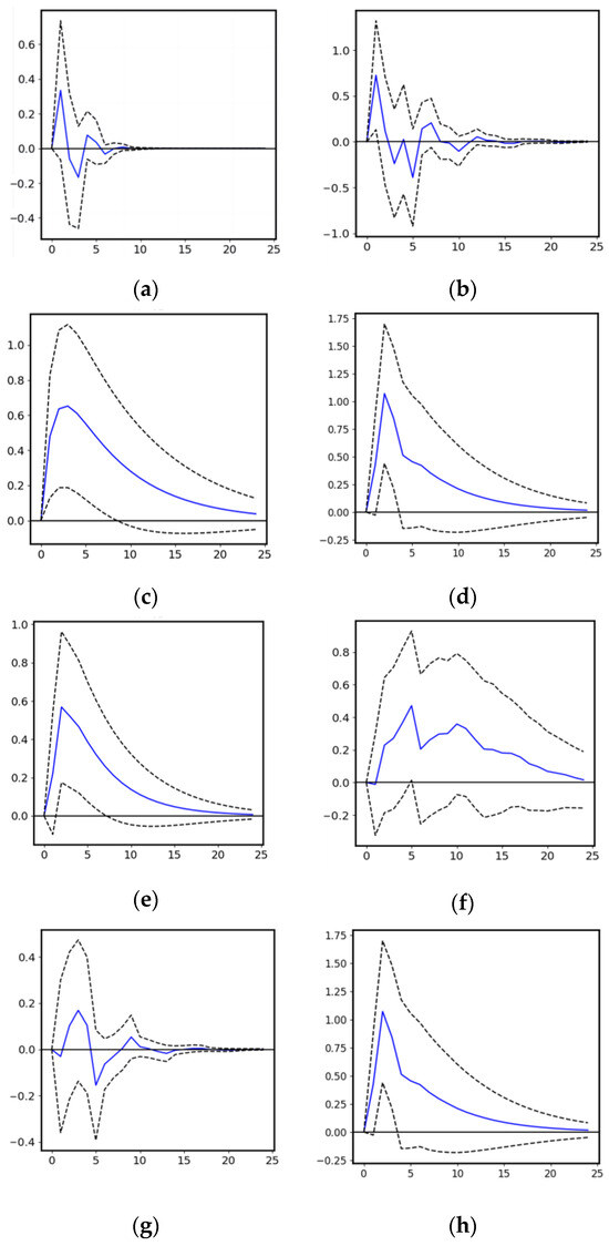 Impulse responses of eight price indices to the RES index: (a) , (b) , (c) , (d) , (e) , (f) , (g) , and (h) .