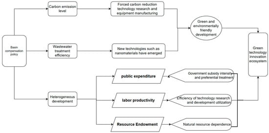 Following the above ideas, this article constructs a mechanism framework for the impact of watershed compensation policies on the green technology innovation ecosystem, as shown in Figure 1.