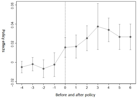 In this formula, k denotes the kth year following the introduction of the watershed compensation policy; represents the initiation year of the pilot watershed compensation policy in city i; denotes the parameter to be estimated for the control variables; and signifies a set of dummy variables corresponding to the enactment of watershed compensation policies. Because the research sample design policy implementation occurred over a period of 18 years, involving more years than our study period, the data before the—fourth period and after the sixth period of the merger were used simultaneously to circumvent the issue of multicollinearity; the pilot policy before the first year was used as the base year, that is, in the regression model, to remove the dummy variables in the year. represents the key parameter, signifying the disparity in green technology innovation between the treatment and control groups in year k following policy implementation.