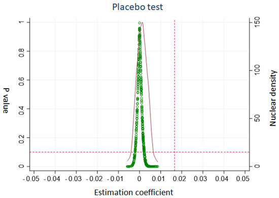 Building upon the aforementioned test results, the model is simulated by randomly selecting samples of the experimental group for regression; specifically, a random selection of 60 cases from the overall sample constitutes the “pseudo-experimental group”, instead of the real experimental group, for regression. The process is repeated 500 times, and 500 estimates are obtained accordingly. The probability density distribution of the estimated coefficients is displayed in Figure 3. The graph indicates that the estimated coefficients with random assignments are roughly around zero, following a normal distribution, and differ from the actual coefficient of 0.0166. This suggests that there is no substantial policy effect on the experimental group that was selected by chance. As a result, it is deduced that the influence of the watershed compensation policy on the green technology innovation ecosystems of the experimental group is authentic, and the shifts observed within these ecosystems can be genuinely ascribed to the policy’s implementation. The absence of grave omitted variable issues in the model further attests to the robustness and dependability of the results obtained from the estimation.