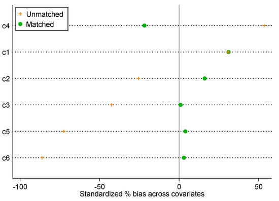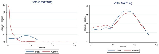 To mitigate potential issues of endogeneity among variables and to assess the robustness of the empirical model, this research employs propensity score matching to address these challenges. Additionally, combining this method with a difference-in-differences approach minimizes sample disparities, enhancing the reliability of the model. In this research, cities that benefit from the watershed compensation policy are identified as the treatment group, while those that do not receive compensation constitute the control group. Using all control variables as covariates, propensity scores are estimated through the kernel matching method, matching the treatment group to the control group at a ratio of one to two. Figure 4 illustrates the standardized deviations of the covariates before and after matching. Examining the sample distribution before and after matching reveals significant differences in the sample distribution prior to matching, with a high degree of dispersion, while the standardized deviation of the samples after completing the kernel matching is significantly reduced, which are all reduced to less than 40%, and the variable selectivity bias can be alleviated. The results of the kernel density curves before and after matching are shown in Figure 5. Figure 5 demonstrates significant improvement in the alignment between the control and treatment groups after the matching process, which attests to the success of the matching strategy.