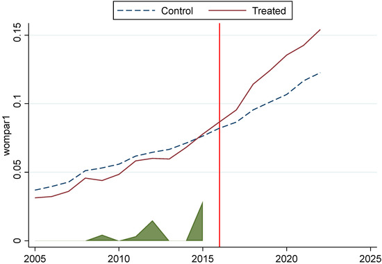 Figure 6 illustrates the variations in the green technology innovation ecosystem among the key cities benefiting from the watershed compensation policy and the corresponding synthetic control cities during the period of 2005–2022, with the dashed line representing the synthetic green technology innovation development level, the solid line representing the actual green technology innovation development level, and the vertical solid line indicating the timing of the policy intervention, marked as 2016 in this analysis. As can be seen from Figure 5, on the left side of the policy intervention time, the trajectory of actual green technological innovation development aligns with the growth trend of the synthetic green technological innovation development level, and the difference between the two groups is very small, which suggests that the synthetic control city closely aligns with the green technology innovation development level of the city receiving compensation before the introduction of the watershed policy. Following the policy’s intervention period, on the right side, the two groups gradually deviate, and the actual green technological innovation ecosystem’s development level is significantly higher than the synthetic green technological innovation ecosystem’s development level, which implies that the hypothesis of this paper—i.e., that the policy of watershed compensation exerts a notably positive influence on the advancement of green technological innovation ecosystems, with a pronounced effect in the compensated cities—holds.