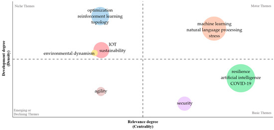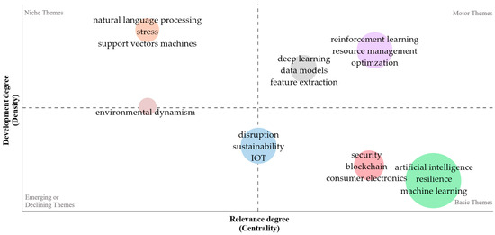 Basic themes, of general importance in the researched field, are grouped in two clusters. The first cluster, green, is larger and considers “artificial intelligence”, “resilience”, and “machine learning”, defining concepts for our work, while the second cluster considers “security”, “blockchain”, and “consumer electronics”. The motor themes designate the areas that help the development of the domain, and in the present case, they are exposed through two clusters: (1) a purple one represented by “reinforcement learning”, “resource management”, and “optimization”; (2) a gray one related to “deep learning”, “data models”, and “feature extraction”. Niche themes are less explored, rendered by terms that interact but in a peripheral way and include “natural language processing”, “stress”, and “support vector machines”. At the intersection of these and other emerging themes is “environmental dynamism”, and at the intersection of emerging and basic themes “disruption”, “sustainability”, and “IOT” meet each other [81].