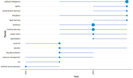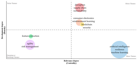 The basic concerns keep their perspective of AI in relation to resilience, but this time the theme is complemented by the concept of “machine learning”. In the area of motor themes, there are some interesting changes, with the focus shifting to (1) supply chain disruptions in sustainable frameworks; (2) reinforcement learning for consumer electronics; and (3) blockchain security. During this time, the niche themes have completely disappeared, the emerging themes are starting to gain momentum, with agility being linked to risk management, and in addition to these, feature extraction is also appearing, though it is not yet addressed very much, representing a rather specialized element in the area of data analysis that deals with their classification, grouping, and diagnosis [92].