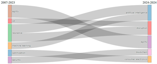 Figure 5 completes the conceptual structure, presenting the thematic evolution of the topic of including the adaptability, agility, and resilience of AI in management systems, revealing the existence of two periods that have shaped it, namely 2007–2023 and the period of the current year (2024). It can be easily noticed that there are no major changes between the two periods, with the theme maintaining its fundamental pylons over time. According to Popa, Banciu, and Ștefan [89], for a better understanding of the thematic evolution, Figure 5 will be analyzed in parallel with the mapping of the two conceptual diagrams that describe the periods of the analysis.