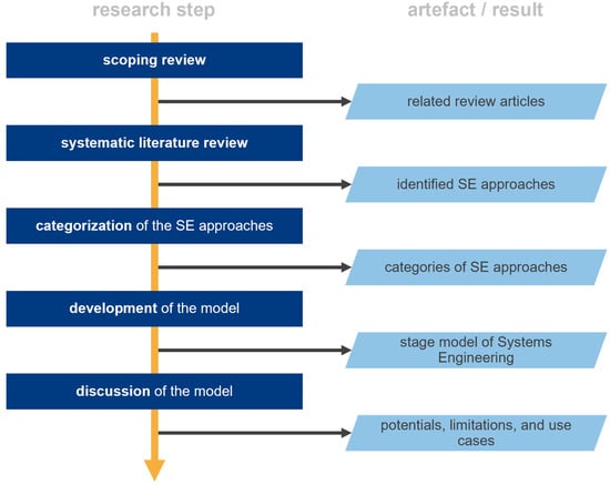 This research is conducted based on the scientific, application-oriented research approach by Ulrich [8] in five steps, as shown in Figure 1. In the first step, a scoping review is conducted to identify related work. Based on this, the literature is reviewed to identify the broad variety of established Systems Engineering approaches. In the next step, meta-data analysis and bibliometrics as well as content analysis are proceeded to categorize the SE approaches. Based on these results, the model of four stages of Systems Engineering is developed. Ongoing practical use cases are described at each Systems Engineering stage. Finally, the model is discussed to identify strengths and weaknesses as well as further research fields.