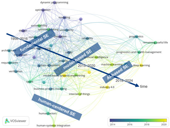 In the next step, the results are analyzed on a time-related view (see Figure 3). A time shift in terms of importance of keywords becomes visible. While fundamental Systems Engineering aspects have been the focus of research since the 1960s, between 2015 and 2018, model-based Systems Engineering including sysML became an important research field. Since 2018, aspects of artificial intelligence, machine learning, and internet of things have become the focus of research. Based on the analysis of meta-data and bibliometrics, the following clusters of Systems Engineering research fields, highlighted in Figure 3 and explained in Table 2, are derived.