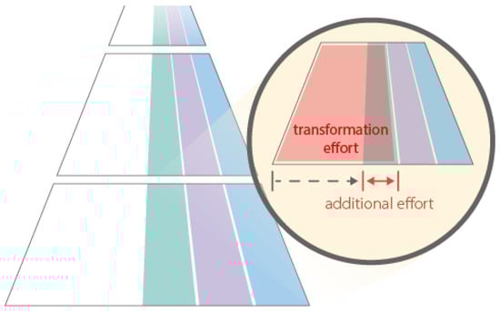 When considering stage model as a pyramid, the implementation effort becomes visually apparent. This model is predicated on the assumption that the initial effort is the greatest and that the additional effort decreases as the transformation progresses (vertical progress in the model). For instance, fundamental principles must be developed and implemented at the initiation of the implementation of Systems Engineering. This necessitates a substantial effort in the definition, piloting, and operationalization of PMTE, for example. As the transformation progresses, smaller transformation scopes are added, which build on the previous ones. However, special attention must be paid to the additional effort required for the specialization of the SE approach. Figure 6 shows the basic model visually. When further dimensions are considered, the transformation effort visually increases in volume.