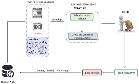 To solve the above challenges, we propose MR-CSAF, an adaptive multimodal recommendation algorithm based on cross-self-attention fusion. As shown in Figure 1, MR-CSAF builds on FREEDOM by adding an adaptive modality selector and a cross-self-attention fusion module. First, MR-CSAF’s adaptive modality selector dynamically adjusts the weights of different modalities to ensure that the features of each modality are learned in a balanced manner during training, even under data imbalance. MR-CSAF’s adaptive modality selector is able to dynamically adjust the attention between different product image and text modalities according to the current interaction context and user preferences. This dynamic adaptation mechanism enables MR-CSAF to adaptively optimize modal contributions in different scenarios, thus improving the accuracy and robustness of the recommendation system. The cross-self-attention fusion module propagates information between text and images, transferring information within each modality through the self-attention mechanism. Using this module, we can explicitly model the interactions between text, images, and interactions within modalities. These features are later propagated and aggregated across the user–item graph through a GNN. We performed experiments on three publicly available benchmark datasets. Our experimental results show that our model outperforms existing baseline approaches.