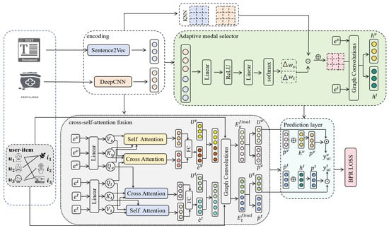 As shown in Figure 2, MR-CSAF uses Sentence2Vec [32] and DeepCNN [33] to extract features from texts and images, respectively, constructs a KNN modality-aware graph using original features for each modality m, and aggregates the modality-aware graphs using an adaptive modality selector. Next, the extracted feature information is fed into the cross-self-attention fusion module to learn the inter- and intra-modal interactions of text and images. Finally, the user-modal features are linked to the corresponding user-modal features and propagated through the user–item interaction graph to obtain the final feature representation. This representation is passed through another prediction layer tailored for downstream recommendation tasks.