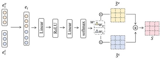 where , is the learnable matrix, , is the bias term, is the ReLU activation function, and ensures that the outputs are modal weights, generating the corresponding image and text modal weights denoted as and .
