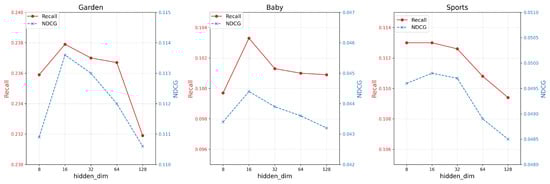 When tuning the parameters of the adaptive modality selector, we experimentally set the hidden layer sizes to candidate values of 8, 16, 32, 64, and 128. We then assessed their impact on Recall@20 and NDCG@20, as illustrated in the results of Figure 4. Our findings indicate that a hidden layer size of 16 yields the best performance on the Garden, Baby and Sports datasets. Compared to other hidden layer dimension sizes, may provide the model with the appropriate expressiveness to capture the complex inter-modal relationships in these three datasets more effectively, while avoiding the risk of overfitting associated with too high a dimension.