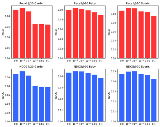 We set the MR-CSAF feature transformation loss to the following values: 0.0, 1 , 1 , 1 , 1 , 1 . This was completed to investigate how this hyperparameter affects the model’s recommendation performance. Figure 5 illustrates its impact on Recall@20 and NDCG@20 across three public datasets. Notably, the value of 1e-05 achieves the best performance on all datasets. However, increasing this value leads to a decline in performance. A larger loss may hinder the model’s ability to fully leverage useful features within the dataset. In this scenario, the contribution of the feature transformation loss to the total loss function becomes significantly larger, causing the model to concentrate excessively on feature transformation during training. This heightened focus can make the model more sensitive to noise and outliers in the original data. Conversely, a value that is too small may undermine the model’s generalization ability, resulting in poor performance on unseen test data.