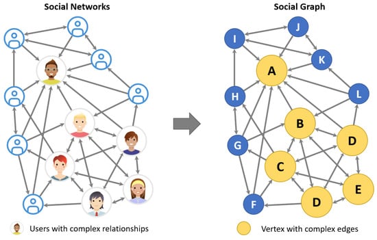 As is known, the relationships among users on the social network are often modeled as a social graph [4]. Given a connected directed graph with a set of vertices of n vertices and an edge set of m edges, each vertex represents a user and each edge indicates the interconnection between users. Note that the type of interconnection can be friends, commercial advertisements, or even geographically adjacent. For generalization purposes, we describe the type of interconnection as information dissemination that will be used throughout the paper. Figure 1 shows an example of the social network in social media and its corresponding social graph. To be specific, there are 13 users and 49 following relations in the graph. If user B follows user A, a directed edge from B to A is linked. A classical optimization problem is to find a minimum set of nodes that can cover the entire social graph, known as the social network coverage problem (SNCP) [5]. The optimal solution of SNCP in Figure 1 is {}, indicating that the information dissemination to all users can be carried out through users A and B. Although it is easy to provide an optimal solution in such a small graph, it will be quite difficult for large or massive graphs, which often match the scale of the real social network. Moreover, the optimal solution of SNCP can reach a very high magnitude, for example, 1868903 vertices for soc-livejournal instance from the Stanford Large Network Dataset Collection Library [6]. On this occasion, another important issue arises: how to disseminate information through a fixed number of users so as to achieve the maximum dissemination effect in a large-scale social network? Take the social graph in Figure 1 as an example again. If we aim to choose only one () user to spread the information, user A is preferred as it influences the other nine users, i.e., .
