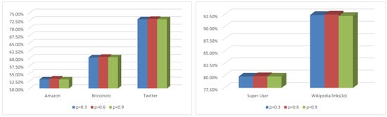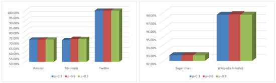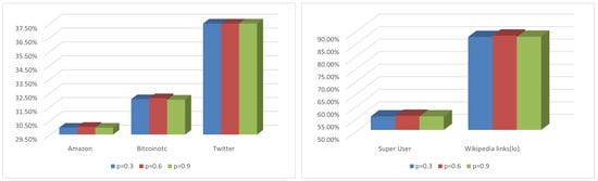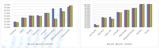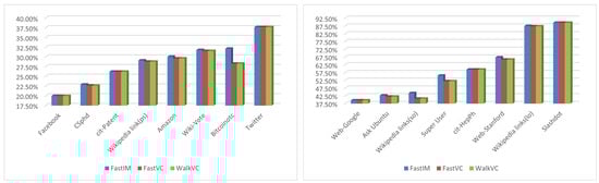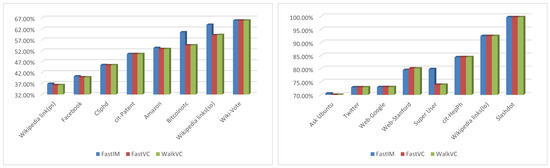 Table 6 shows that FastIM outperforms the other two compared algorithms in terms of on 15 out of 16 instances. For the remaining instance, Web-Google, all the algorithms achieve the same results. In addition, on Slashdot and Wikipedia links (lo), the proposed algorithm can even achieve 89.58% and 87.50% influence propagation coverage as they are denser graphs. This indicates that by selecting just 20% of users, our method can influence more than 87.5% of the total user base, demonstrating its effectiveness in maximizing influence propagation. It is important to note that the propagation coverage upper bound varies across different graphs, particularly those with differing densities. For instance, in sparse graphs like Facebook, which has 2888 vertices and 2981 edges, selecting 20% of the vertices may yield coverage close to 20%. We obtain a coverage result of 19.99% under the FastIM algorithm, which reflects its effectiveness. This variability is why the propagation coverage differs significantly in Table 6. To assess the stability of the algorithm, we utilize the metric. A smaller variance between and indicates greater stability. As shown in Table 6, all three algorithms demonstrate considerable stability. While we cannot ascertain the exact propagation coverage for each instance at k = 20%, our findings suggest that our method is the most effective among those tested.