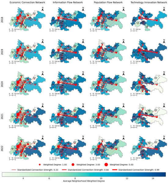 Among the subnetworks, the information network is the most prominent dual-core-driven network. Chengdu and Chongqing occupy significant positions in the network with prominent weighted degrees and tight connections, while the rest are ‘collapsed’ peripheral areas with barriers to information flow. Nonetheless, this prominent pattern of disequilibrium is gradually weakening, as evidenced by the large year-to-year reductions in the standard deviations in Table 1. Its simultaneous large reduction in the mean also suggests that flows within the urban agglomeration are declining annually. The planning and development of smart cities have made it easier to obtain and transmit information securely. Thus, the exchange of information is no longer confined to neighboring regions but has spread from within the urban agglomeration to outside of it. In general, the information flow within the urban agglomeration is becoming weaker and more balanced.