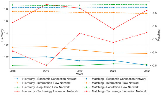 Matching assesses the correlations between the connected objects and indicates the assortativity or disassortativity between city networks [8]. Degree correlation effectively measures the matching [49] and is determined using Equations (4) and (5). A network is assortative when cities are connected at the same level (positive correlation, ); that is, the high-level nodes are connected, and the low-level nodes are connected. Conversely, a network is disassortative (negative correlation, ) when there is high connectivity between the core city and the peripheral cities, which allows the elements to circulate smoothly across the entire network. Disassortative networks are usually highly resilient as the impact of events cannot disrupt the overall network’s operational structure.