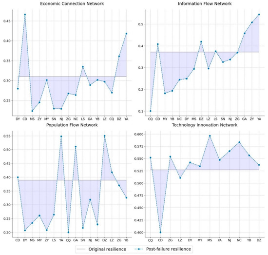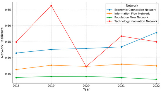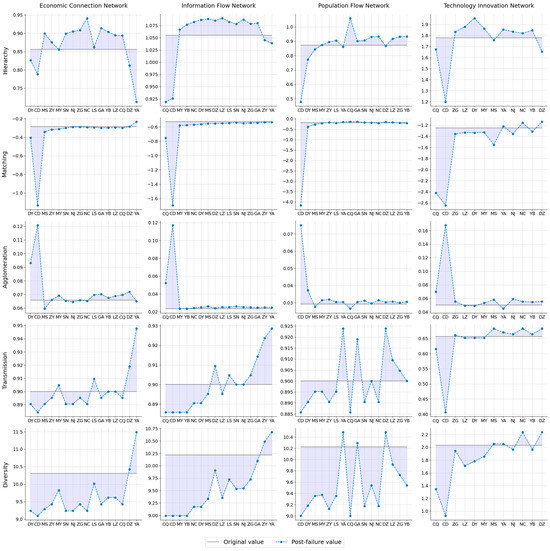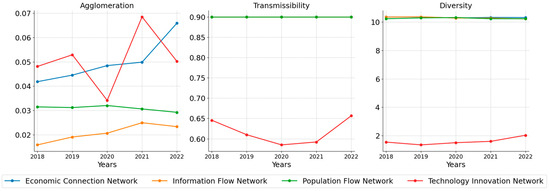 According to Figure 7, the economic, information, and population networks all possess excellent transmissibility and diversity, indicating that elements can be distributed and transmitted between any two cities at low cost (e.g., time, distance, or other resource consumption) through multiple pathways. By contrast, the low transmissibility and diversity in technology networks suggest that information, knowledge, and resources related to digital technological innovations are difficult to circulate effectively between cities. This limitation may hinder regional innovation potential, as new ideas and innovations often originate from cross-domain collaboration. Moreover, in emergency situations (e.g., natural disasters), inefficient and monolithic technical cooperation networks hinder the rapid distribution of critical services and resources, such as disaster monitoring and smart healthcare, seriously affecting a city’s ability to respond to emergencies and reconstruct after a disaster.