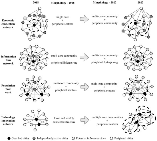 Combined with the previous analysis of the six indicators, the four types of urban nodes are connected and clustered in different ways in the four networks, resulting in the networks taking on a particular morphology, as shown in Figure 8. Although their settlement morphology and spatial evolution are different, they all show a “core/periphery” structure. The core part is mainly composed of core hub cities and independent, active cities; the peripheral part mainly consists of potential influencer cities and peripheral cities, in which the potential influencers, as the transferring intermediaries of the elements in the process of spatial evolution, have gradually increased their influence, and occasionally enter the core circle of the network.