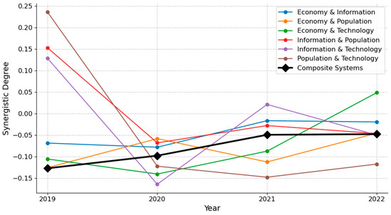 The information flow network is characterized by a ‘multi-core community + peripheral linkage ring’ and has not evolved significantly during the study period. It is a typical Chengdu–Chongqing dual-core driven network, which coincides with the positioning of the urban agglomeration. Potential influencer cities and peripheral cities are interconnected to form a locally networked peripheral linkage ring without significant agglomeration. Similarly, the shape of the population flow network has not changed significantly over the five-year period and remains broadly based on the pattern of ‘multi-core community + peripheral scatters’. In contrast, the agglomeration of the population network is slightly stronger than that of the information network. Apart from Chengdu and Chongqing, the core hub cities in the population network—Meishan and Deyang—have joined the core community as population mobility centers in the urban agglomeration. There are radial connections between the core and periphery in both the information and population networks, but the peripheral parts of the population network show a scatter pattern. It can be seen that there are challenges in the population mobility between the periphery of the network. This circle-like radial spatial structure requires measures and time to develop into a more resilient networked space.