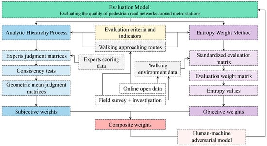 This study applies a combination of the AHP and EWM to assess the quality of pedestrian road networks in metro catchment areas. The AHP model is a structured technique that uses experts’ scoring data, collected through a questionnaire survey, to estimate the weights of criteria and indicators. It is a subjective weighting method achieved by comparing the correlations and importance of the indicators, constructing judgement matrices and solving for the eigenvectors [37]. The EWM model is an objective method for assessing the weights of indicators based on the information they contain, which can mitigate the subjectivity associated with the AHP method. The higher the entropy value of an indicator, the greater its degree of dispersion and the amount of information it provides. Consequently, it should have a more significant influence on the quality evaluation and be assigned a larger weight, and vice versa [38]. Online multi-source data reflecting the walking environments around the selected metro stations in Tianjin, integrated with supplementary data collected through field investigation, are used to estimate the EWM model. Additionally, a human–machine adversarial scoring model [39] and cosine similarity are employed to test the evaluation system’s rationality and the evaluation results’ accuracy.
