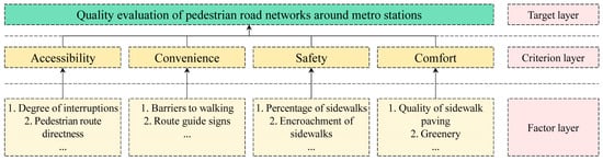 The core idea of the AHP model is to divide complex decision-making problems into multiple layers. In this study, the target layer evaluates the quality of pedestrian networks within the stations’ catchment areas. The criterion layer encompasses the accessibility, convenience, safety, and comfort of walking routes to metro stations, while the factor layer comprises indicators related to walking environments along these routes. The structured hierarchical framework is depicted in Figure 2.