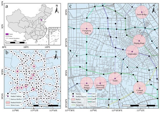 Location of the study stations. (a) Location of Tianjin in China; (b) metro stations with 600 m radius buffers in central Tianjin; (c) the eight selected stations.