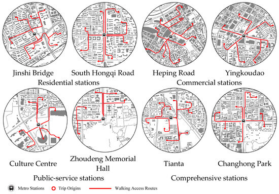 Metro stations in Tianjin vary significantly in spatial layouts, land use, population density, and passenger flow characteristics within their catchment areas. To comprehensively understand the walking environments around the stations, we applied the K-Means clustering algorithm to analyze the features of urban construction land within a 600 m radius of the 87 stations. This analysis grouped the stations into six categories, including residential, commercial, public service, transport, comprehensive functions, and others. Among the six categories, transport stations primarily serve as hubs connecting to train stations and the airport, and the “others” encompass stations that are either planned or currently under construction. Considering the diversity of station types and the availability of relevant data, we systematically selected eight stations across the remaining four types, each with a 600 m radius buffer, as our study sites.