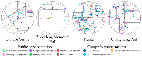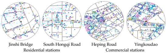 POIs transform specific places where people conduct daily activities into point data with geographical attributes, reflecting the functional characteristics of the station’s catchment area. The POIs data employed in this study were obtained through the Baidu Map API and mapped on the pedestrian network using ArcGIS (version: 10.8).