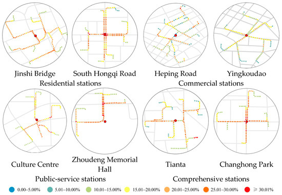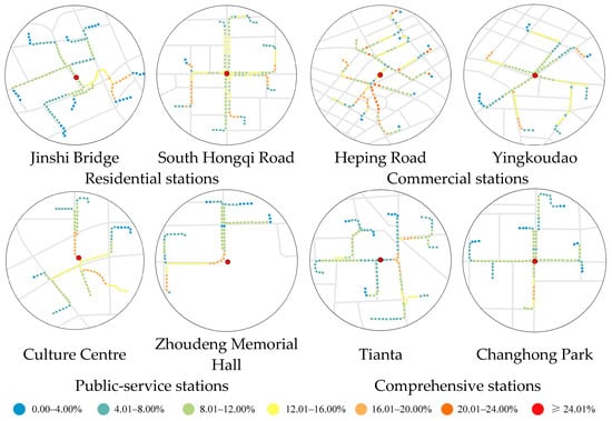 Sidewalks in all station catchment areas are well constructed, with over 90.00% of the walking routes being situated on sidewalks. However, encroachment is a common issue: sidewalks near commercial stations are often obstructed by stalls and parked motor vehicles, while shared bicycles frequently occupy those near comprehensive stations [81,82]. The provision of protected sidewalks shows a low correlation with the types of stations, from 84.82% at the Culture Centre station to 8.73% around the Jinshi Bridge.