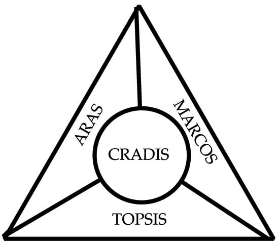 While there are numerous MCDM evaluation methods, the CRADIS method and its extension to the GST are used in this research. The CRADIS can be considered as a hybrid method that incorporates aspects of each of the other three MCDM methods. It ranks alternatives by considering both their distance to an ideal solution (like TOPSIS) and compromise-based solutions (like Measurement of Alternatives and Ranking according to Compromise Solution (MARCOS)), while also factoring in additive assessments similar to the Additive Ratio Assessment (ARAS) as shown in Figure 2. ARAS is based on a utility degree that evaluates each alternative by summing up weighted values for criteria. The method uses an additive approach to determine the overall preference of each alternative relative to an optimal solution [62]. Furthermore, MARCOS seeks a compromise solution, but it introduces a more detailed assessment of the alternatives’ relative performance compared to a reference point. This method evaluates alternatives through a distance-based approach while incorporating the concept of utility functions to better handle diverse decision-making contexts [63]. TOPSIS ranks alternatives by calculating their distance to an ideal solution and a negative ideal solution. The best alternative is the one that is closest to the ideal solution and farthest from the negative ideal solution [64].
