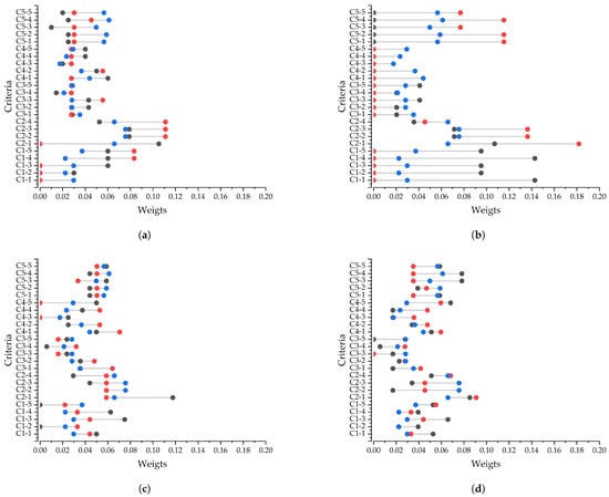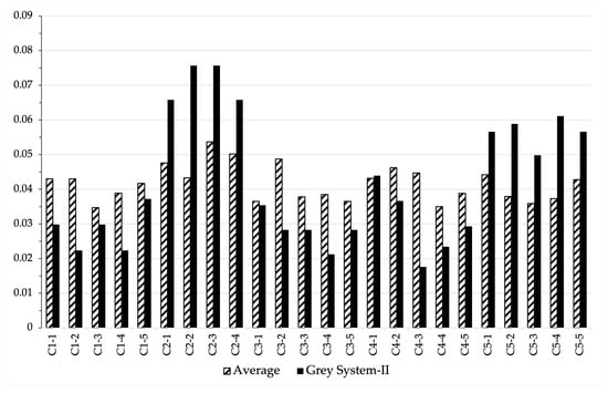 The Grey-CRADIS method, in contrast to WSM and TOPSIS, extends the ranking process by considering uncertainties in DMs’ evaluations through grey numbers. This method, outlined in earlier sections, adjusts for the uncertainty in performance values by computing grey decision matrices, ideal and anti-ideal solutions, and deviation from ideal solutions (Equations (27) and (30)). Unlike WSM and TOPSIS, Grey-CRADIS provides a more robust solution when uncertainty in the data is significant, as it accounts for both the best- and worst-case scenarios while weighting DMs’ preferences in a more dynamic way.
