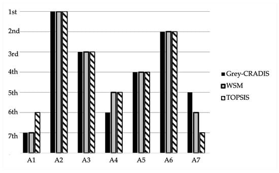 Based on Figure 7, the seven alternatives ( to ) using the Grey-CRADIS, WSM, and TOPSIS methods reveal a strong consensus across all three methods. Company-2 () is consistently ranked by Grey-CRADIS, WSM, and TOPSIS, indicating that it is the best-performing alternative. Similarly, Company is uniformly ranked third, while Companies and consistently rank at the lower end (sixth or seventh), reflecting their lower performance. There are minor variations in the rankings for Companies and , with WSM and TOPSIS ranking Company-4 () the fourth position and Company-6 () the second position, while Grey-CRADIS ranks Company-4 () the fifth position and Company-6 () is ranked in the third position. Despite these small differences, the results demonstrate strong alignment among the three methods, confirming their reliability in evaluating the alternatives.
