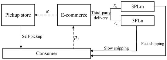 Consider a pure e-commerce retailer collaborating with third-party logistics (3PL) providers to fulfill online orders. We assume that there are two 3PL providers, 3PLm and 3PLn, offering different service levels. The transportation times with these providers are and , respectively, where , indicating that 3PLm has shorter transportation times and provides higher logistics service levels. Since shorter transportation times lead to higher product quality in the market, quality is modeled as a decreasing function of transportation time, denoted by parameter . For analytical simplicity, the quality function is assumed to be linear, , where represents the maximum product quality delivered to the market under the benchmark of instantaneous delivery (). This does not imply that zero transportation time occurs in practice; rather, it serves as a normalization baseline to anchor the quality decay function. This modeling approach is consistent with previous studies [4,8,18], where similar assumptions are widely adopted in the channel and logistics literature to represent the upper bound of service efficiency. In this context, shorter delivery times are naturally associated with higher perceived product quality. The analysis primarily considers four scenarios of retailer–logistics collaboration: (i) the online retailer does not operate an In-Store Pickup channel; (ii) all online orders are fulfilled exclusively by 3PLm; (iii) all online orders are fulfilled exclusively by 3PLn; and (iv) the retailer collaborates with physical stores to provide In-Store Pickup services for online orders. These four scenarios form the basis for comparing logistics strategies under heterogeneous service levels, as illustrated in Figure 1.