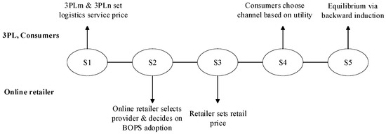 The sequence of events in this study is as follows. First, third-party logistics providers set the service price for the online retailer. Second, the online retailer selects a logistics provider, decides whether to collaborate with physical stores for In-Store Pickup, and sets the retail price. Third, consumers choose their purchasing channel based on utility. Finally, the equilibrium for both the online retailer and logistics provider is determined through backward induction, comparing equilibrium profits under different In-Store Pickup scenarios.