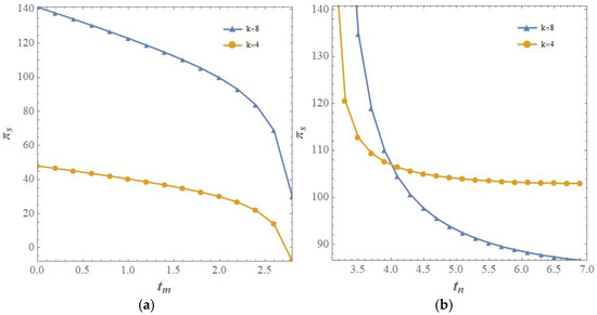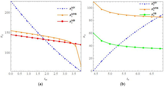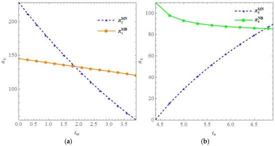 Next, the difference in retailer profits between the MB and NB models is compared, as shown in Figure 4b. From Figure 4b, it can be seen that when the unit operating cost of In-Store Pickup services is low, the MB model is more advantageous. Specifically, when is small and the difference between the third-party logistics provider’s delivery time and the consumer’s In-Store Pickup time is small, the advantage of 3PLm’s delivery is not obvious. In this case, the retailer can save logistics costs by offering In-Store Pickup services, thus adopting the MB model for higher profits. However, as the consumer’s In-Store Pickup time increases and closer to 3PLn’s delivery time , the NB model becomes more advantageous for the retailer. On the other hand, when the unit operating cost of In-Store Pickup services is high, the NB model is superior to the MB model. This is because, for the retailer, 3PLn’s service prices are lower, and to avoid high operating costs, adopting the NB model is more beneficial.