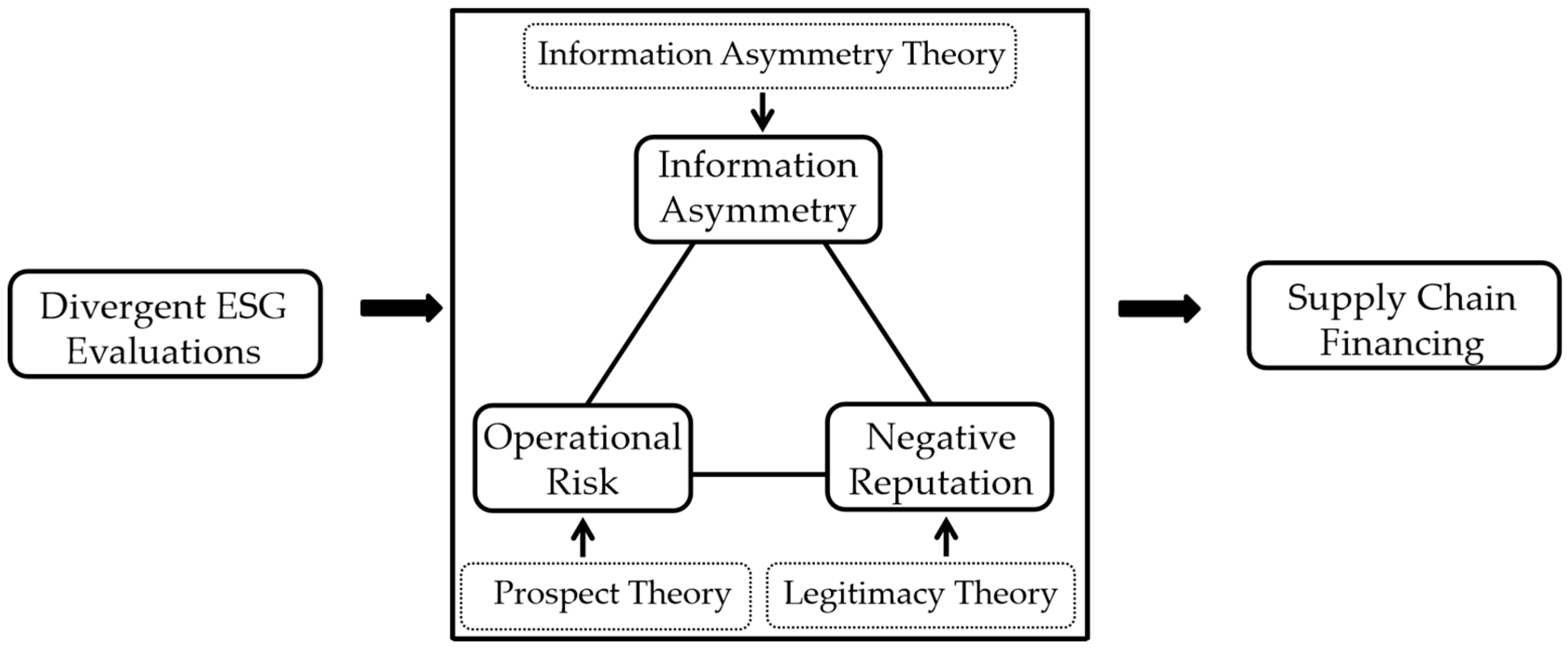 In summary, we believe that divergent ESG evaluations negatively affect supply chain financing by increasing information asymmetry, operational risks, and reputational damage (Figure 1). Accordingly, our hypothesis is: