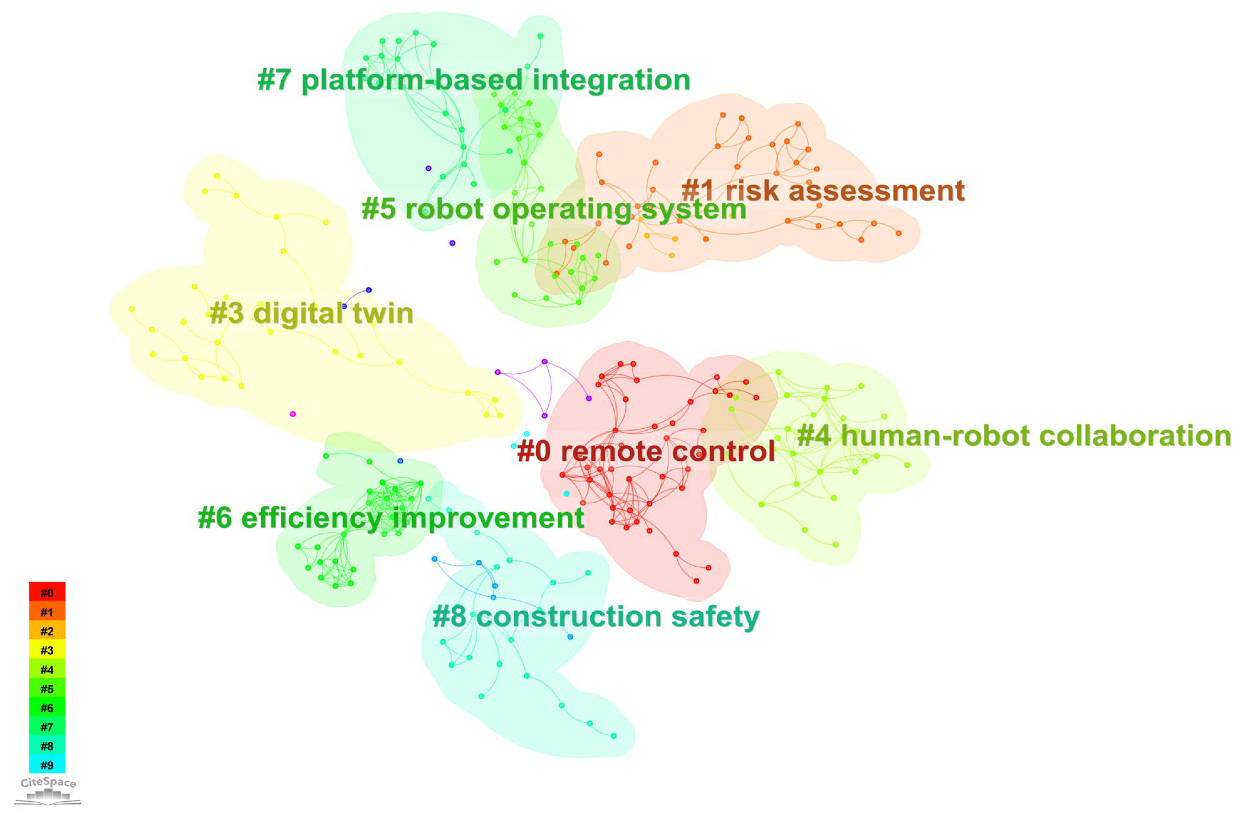 | (1) Remote intelligent machinery | #0 “Remote control | “camera”; “excavator”; “teleoperation system”; “feedback”; “augmented reality”; “end effector”; “construction machinery” | Lee, Ham et al., 2022 [7]; Chen et al., 2016 [39]; Le et al., 2017 [60]; Kim et al., 2009 [40]; Nagano et al., 2020) [41] |