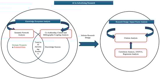 While AI provides numerous strategic advantages, including computational advertising that enables greater matching accuracy, efficient customization, and contextual interaction between users and ads [10,11], the literature remains fragmented. Current studies tend to emphasize (1) technical applications such as Click Through Rate (CTR) predication, recommendation systems and automated bidding; (2) consumer-facing outcomes, such as engagement, personalization, and brand loyalty; or (3) risk consideration, such as data privacy, algorithm bias, and transparency [12,13,14]. Nevertheless, integrative analyses that map how these themes connect within the broader knowledge ecosystem of AI advertising are lacking. A knowledge ecosystem is being designed as the dynamic network of actors, institutions, and technologies that collectively generate, share, and apply knowledge [15]. Moreover, while scientometric approaches have been used in related field [16], predictors of high-impact research in AI advertising, such as collaboration patterns, institutional influence, and thematic positioning, remain underexplored.