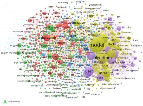VOSViewer and NodeXL Pro tools were used to construct and analyze the network [46] to identify growth and trends, identify topics and contributors [47], and map and visualize scientific domains. VOSviewer, in particular, provides advanced bibliometric mapping capabilities that convert large and complex datasets into clear visual representations, enabling the detection of thematic clusters, collaboration patterns, etc. These capabilities are enhanced when integrated with AI-assisted interpretation to improve research outcomes [48]. It focuses on graphics for large maps, uses visualization of similarities mapping, and creates label, density, cluster density, and scatter views for extensive map analysis [49].