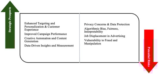 Following topic detection from Table 1, concepts and themes were manually analyzed and grouped into two overarching categories: strategic prospects and potential risks. This categorization adhered to the framework established by Fulton et al. (2024) [64], which analyzes AI’s multifaceted impacts across eight categories: societal, economic, ethical, political, environmental, data, technological, and organizational. Each concept or theme from Table 1 was classified as either a benefit (strategic prospect) or a risk, depending on its context. The resulting data were then organized into a smart chart (Figure 3), revealing that contributors to both strategic prospects and potential risks mainly came from Clusters 2, 3, and 5, as these clusters emphasize application-focused dimensions of AI advertising, making them key drivers of both challenges and opportunities in the field. The smart chart further highlights AI’s central role as a technology driving advancements in AI advertising.