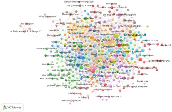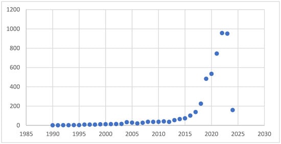 Throughout the analysis process, centrality metrics, clustering techniques, and visualization methods facilitate a comprehensive understanding of the intricate connections and structures within complex networks. Recognizing crucial metrics such as degree, betweenness, and closeness centrality helps identify influential nodes and power dynamics within the network [55,56,57,58], which are of significant interest. The analysis applied parameters such as citation analysis, including all 4880 documents (minimum citations = 0), selecting the top 1000 by total link strength. Co-authorship analysis used complete counting for both countries (maximum 25 per document; all 16 included) and organizations (maximum 25 per document; minimum five documents per sutor, 456 of 5159 authors included). Bibliographic coupling included all documents, with the top 1000 selected by link strength. Term co-occurrence analysis (titles and abstracts) applied a minimum occurrence of 10, yielding 1944 qualifying terms, and the 1166 most relevant (60%) were selected. Several studies have investigated term clustering for identifying topics and trends [59,60]. Clustering enables coherent grouping of communities of nodes that share common themes or interconnected interests, allowing for the detection of cohesive groups of nodes [61,62]. For reference, Table 1, Table 2, Table 3 and Table 4, as well as Figure 2, Figure 4, Figure 5, Figure 6 and Figure 8, were generated using VosViewer. All bibliometric mapping and network visualizations were conducted using VOSViewer with complete counting, applying the parameters detailed above.