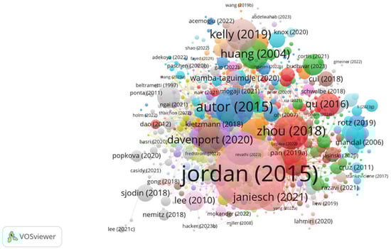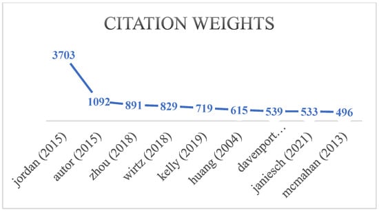 Figure 6 and Figure 7 illustrate how citation weight shapes scholarly influence in the field, addressing RQ1. The most highly cited works are by Jordan and Mitchell (2015), Autor (2015), and Zhou (2018), which reflect different but complementary types of impact. Jordan and Mitchell establish the foundational vision of ML that underpins most AI systems in use today. Autor incorporates a labor and policy perspective, connecting AI development to workforce transformations, which is a growing concern in advertising automation. Zhou’s work on deep interest modeling, already deployed in Alibaba’s ad systems, represents high-impact innovation with precise industrial application. These citation patterns suggest that influence in this space comes from more than disciplinary relevance alone. What distinguishes these works is their ability to define, reframe, or operationalize how AI is applied across systems and sectors, including advertising. This shows how this network of authors shapes how the field understands and applies AI itself.