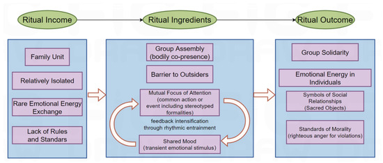 The generation of “emotional energy” through collective rituals is the core of IRC theory, which illustrates the foundation of the process mechanism. Within their original cultural–religious context, rituals serve to create a new social space for indigenous peoples, such as those in Rio Branco, Brazilian Amazon. In this space, activities ranging from ayahuasca ceremonies to political meetings enable the demonstration of symbolic social capital, which breaks social barriers and fosters greater inclusion [77]. A regular religious service with higher frequency but less emotion, such as an observant Jewish service, can allow individuals to socially identify as members of a particular social category. At the same time, rituals with low frequency but higher emotion produce identity fusion, such as that among Navy Seals, which is a powerful unifying force of the self with the group [78] (Rossano, 2020). Rituals are also widely used in modern societies, such as schools in West Virginia, which regularly hold ritualized school–community meetings including songs, speeches, readings, and other activities to build social capital, resulting in a rise in student attendance and library funds [78]. Thus, different forms of religious, social, or political identification come from various types of group rituals [79].