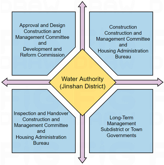 Secondly, they adopted a “four-quadrant” implementation pathway. In our case study, the reconstruction of the secondary water supply system in J Estate was structured into four sequential stages: approval and design, full-cycle construction, inspection and handover, and long-term management. We summarize these findings in a “four-quadrant” implementation roadmap (see Figure 4), which illustrates the overall leadership of the Jinshan District Water Authority by responsible entity and the management objectives for each stage. It ensured that every task is rule-based and that accountability is traceable, thereby improving the efficiency of secondary water supply governance. In the stage of approval and design, the Water Authority, Construction and Management Committee, and Development and Reform Commission jointly review the project design submitted by the water utility and the constructor against relevant industry standards and provide technical guidance. In the construction stage, the Construction and Management Committee, the Housing Administration Bureau, and the Water Authority supervise the constructor throughout the project, requiring prompt rectification of any deficiencies. In the inspection and handover stage, in accordance with applicable regulations, the same three agencies conduct rigorous document audits and onsite inspections before the formal handover. Until the end of the long-term management, the Water Authority scores and evaluates subdistricts or town governments quarterly and annually on their stewardship of secondary water facilities. These assessments are tied to the performance reviews of subdistrict leaders. Unified evaluation criteria, scoring rubrics, and standardized daily management logbooks are issued throughout the district. Additionally, a tripartite agreement is signed between the water utility, the resident committee, and the property management company, stating that the secondary water supply facilities are the common property of all homeowners. At the same time, the responsibility for daily operation, inspection, and maintenance is transferred to the water authorities. Routine patrols and upkeep are carried out jointly by the property management company, the Water Authority, and approved third parties to ensure long-term water quality for residents.