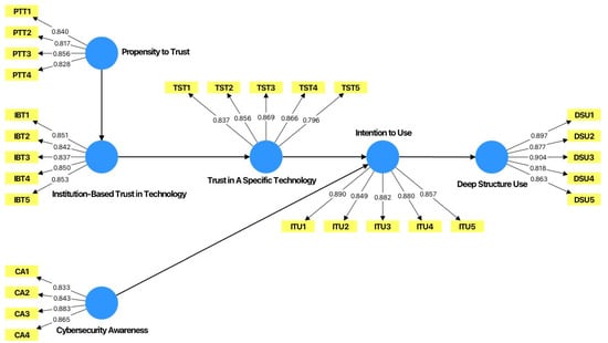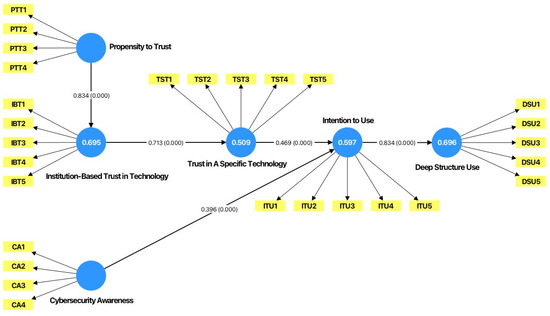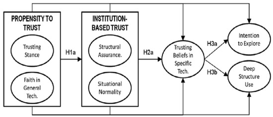 The relationship between intention and deep structure use is influenced by the level of trust users develop in a specific technology. Those who find it functional, helpful, and reliable will develop an intention to explore its features. The intention to use the system leads to deep structure use, where users move beyond basic operations and engage in more advanced functionalities. They gain the necessary confidence to try complex features through their direct experience with the technology, which forms their trusting beliefs. Through this process, intention functions as a motivational link that converts trust into practical technology usage with value [47,80].