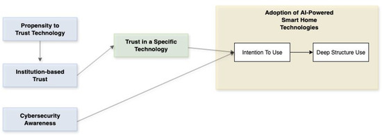 Trust influences both the intention behind and the ongoing use of technology [24]. It plays a crucial role in the adoption of smart home technology. Household trust perception tends to be a determining factor that influences the decision to adopt and use AI-powered IoT devices [26]. However, AI-powered technologies pose a threat to trust [27], threatening households’ security and privacy.