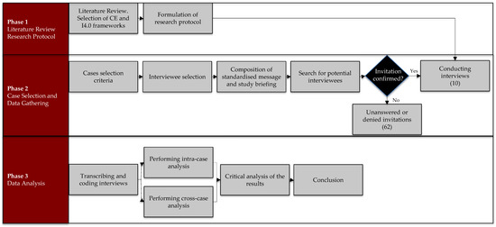 The in-depth literature review identified a research gap and guided the development of the research protocol, following recommendations from [15,16]. A multiple-case approach was adopted, selecting manufacturing companies undergoing the transition to a circular model. Experts from these companies, who implement circular business models and use CE approaches in product development, were interviewed to explore the technologies used to address challenges in the transition. Figure 1 presents an overview of the research design.